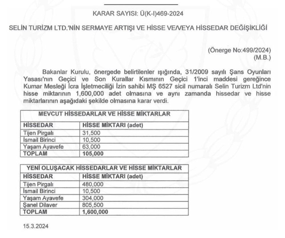 Yeni karar temelinde daha önce 63 bin adet hisseye sahip olan Yaşam Ayavefe’nin yapılan değişiklikle hisse miktarı 304 bine yükseldi. Diğer yandan, Gazedda isimli haber sitesinde yer alan ilgili habere göre, aynı gün alınan karar ile Selin Turizm'in Oscar Resort Hotel’de kumar mesleği icra etmesine yönelik izin de yenilendi.